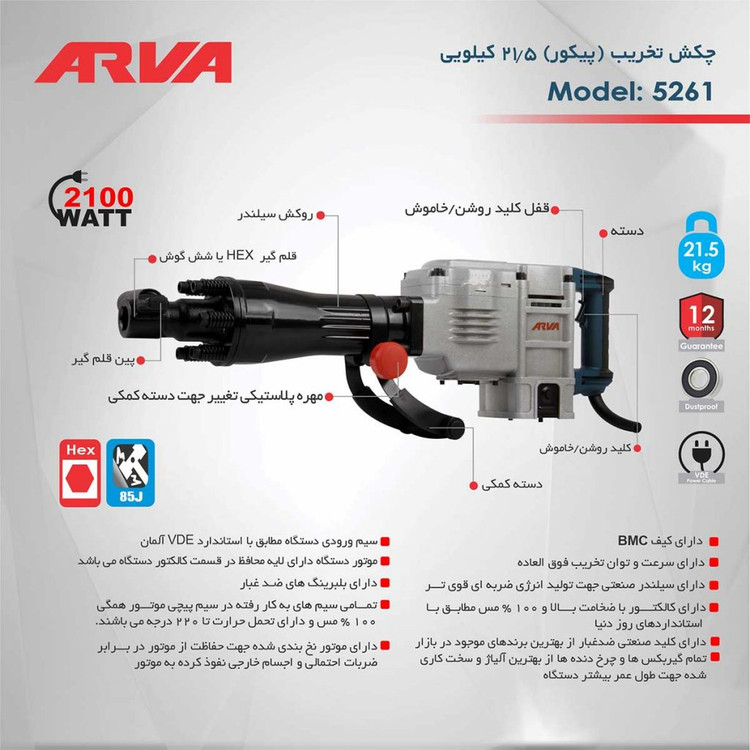 چکش تخریب (پیکور) ۲۱.۵ کیلویی ۲۱۰۰ وات مدل ۵۲۶۱ آروا